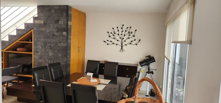 Estancia con Muro de Piedra Escultórico: Una pieza arquitectónica que integra la sala y el comedor bajo una escalera moderna con diseño industrial.
