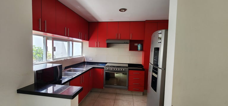 Cocina de Alta Gama: Gabinetes en rojo brillante con encimeras de granito negro; un espacio diseñado para inspirar.