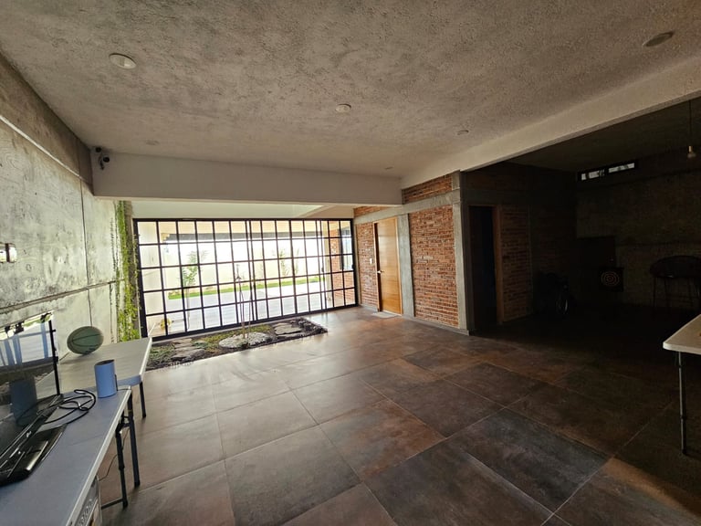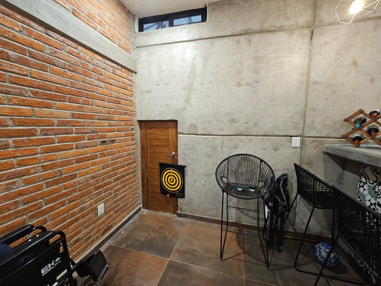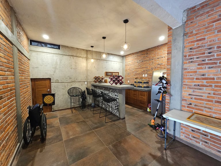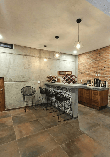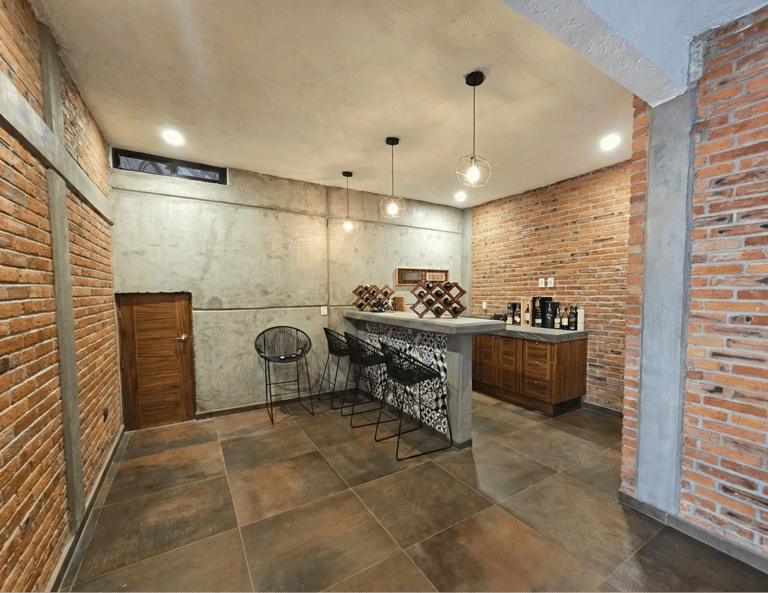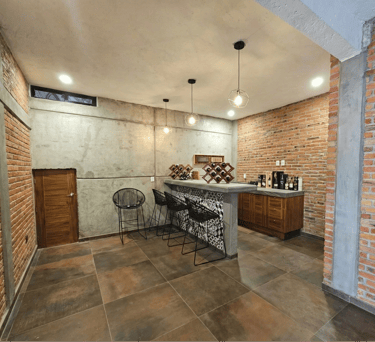 Área Social Exclusiva: Cantina y bar interior con un sofisticado diseño industrial, destacando acabados en ladrillo aparente y concreto, ideal para reuniones y eventos privados.