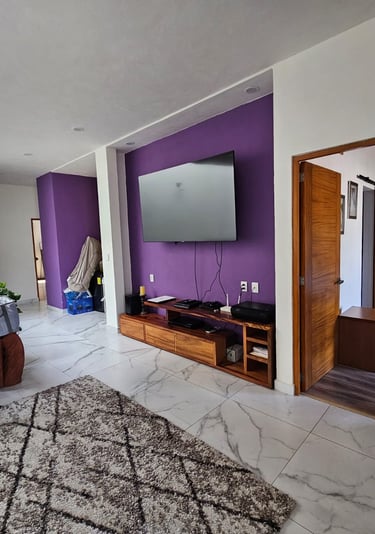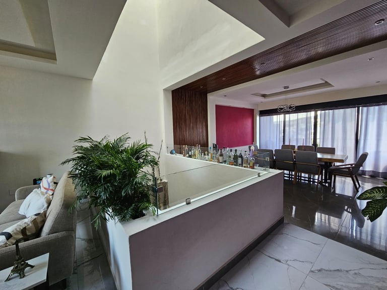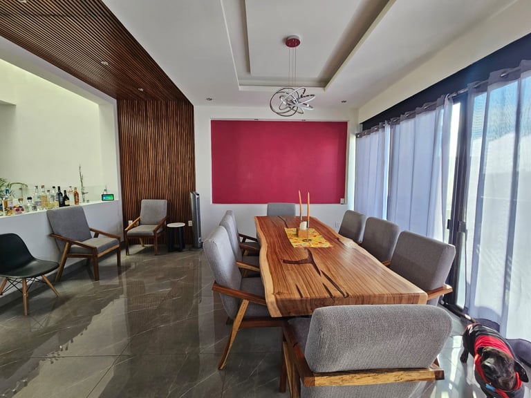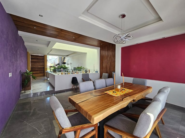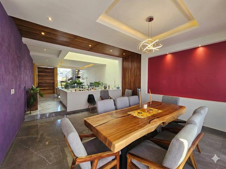 Diseño de Interiores: Amplios espacios de sala y comedor con detalles arquitectónicos en plafones, iluminación cálida y muros de acento.